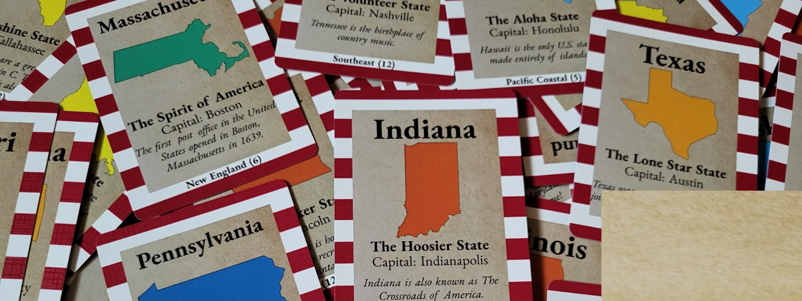 The United Cards of America is a family card game of set collection and shenanigans in honor of America’s 250th birthday. Collect States and complete Regions to earn the most points. Use Actions creatively and watch out for the Government Shutdown!