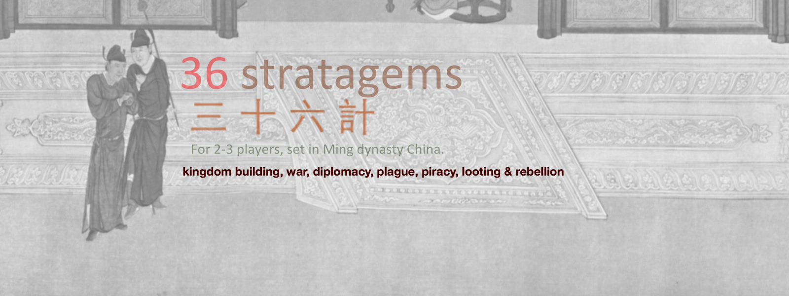 36 stratagems is a game for 2-3 players, which is set in the Ming Dynasty era in China and neighbouring states. You are the leader of one of several rival families aspiring to become emperor of the entire region. You start the game in a capital city, with just an aspiring emperor, a scout and a small army. The aim of the game is to become the dominant dynasty by conquering and maintaining control of capitals, temples and prefectures. Each of these actions will help you in gaining the victory points needed to be the undisputed emperor and win the game. To be successful you will need to manage your budding empire carefully. Manage your economy through taxation and expanding your population, secure stability by maintaining cohesion among the political elite, maintain a strong military through recruitment of units supported by powerful generals and avoid rebellion by gaining popularity with your subjects. You face an uncertain destiny and will encounter many challenges during your reign including plague, piracy and looting. However, you are not alone in your quest, as to help you gain the power you so richly deserve and to undermine your pitiful and unworthy enemies, you can call upon the ancient Chinese wisdom enshrined in the 36 stratagems.