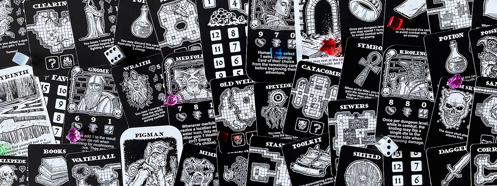 Or you may choose to skip the top card by flipping it to its reverse side and then drawing and placing the next card beside it face-up. The first card now gives you the results for what is in the second room! Sometimes this is risky, but what fun is a dungeon without a little risk...?