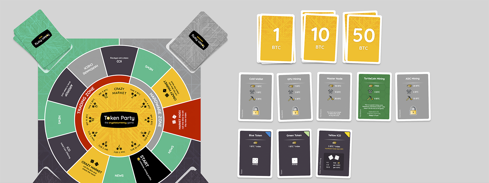 Token Party is a cryptocurrency-based game for 2-6 players, who must achieve specific goals during gameplay in order to win. Players trade Tokens, invest and earn profits from mining, participate in airdrops and initial coin offerings, as in real life. They are at the mercy of the market index, fake news, security breaches, scams and much more. Game mechanics lead to a simple and fun gameplay, mixed with real-world rules.