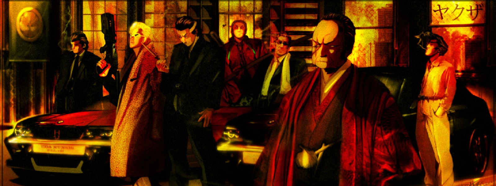 The Seven Star Mob specializes in making sure imported whiskey, vodka, craft beer and champagne flow unimpeded from overseas into the dive bars and high-end geisha restaurants (ryotei) of Tokyo (the Liquor suit). While sake (rice wine) is still the drink of choice in Japan, the industry is completely corporatized and off-limits to the Koreans, so they specialize in bringing in alcoholic beverages from abroad and selling them at a tremendous markup to the Japanese, saving the best soju (Korean liquor) for themselves. As a result, Seven Star Mob gangsters tend to be hard drinking, yet good-spirited sorts, in a slap you on the back and fine you three shots kind of way. Get on their bad side, though, and these self-proclaimed upholders of street justice will bring out the sawed-off shotguns without hesitation. The Seven Star Mob's melee weapon of choice is the bo staff, and ranged weapon of choice is the sawed-off shotgun. Their color, blue, represents salty ocean breezes and the sea in all its clarity, calmness, and penchant for sudden, tsunami storms.