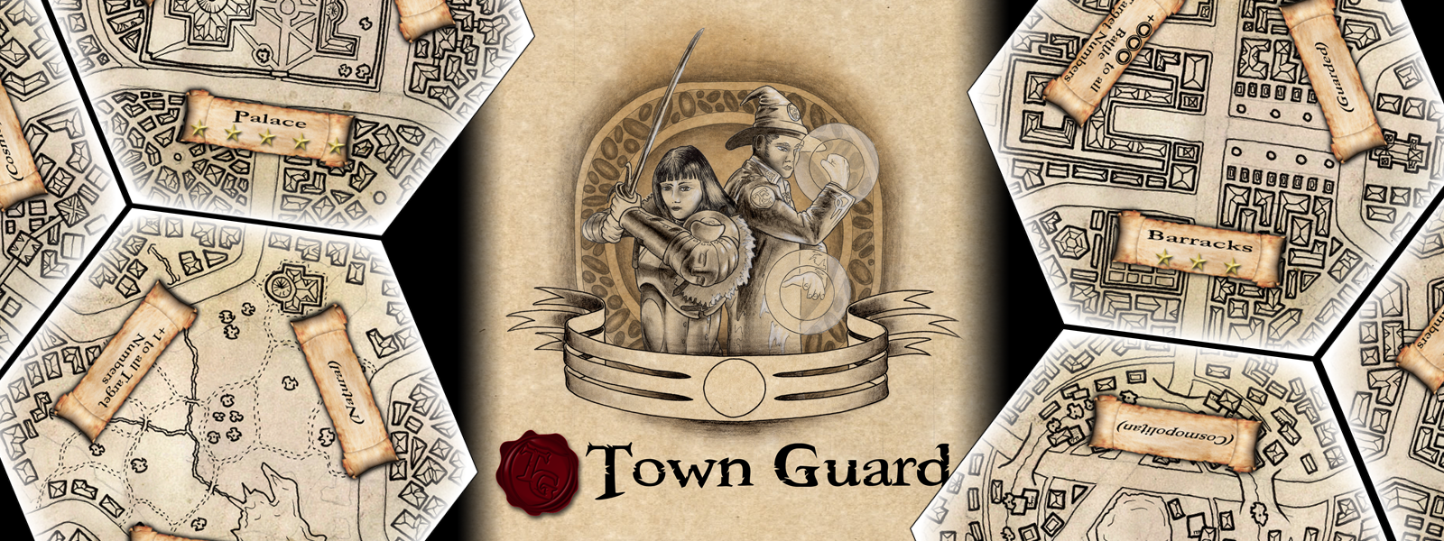 Town Guard is a game combining elements of roleplaying, strategic game play and a bit of chaos. It uses a fusion of card play and dice to keep the action moving quickly, and allows for a huge diversity of character types, advancement and victory conditions.