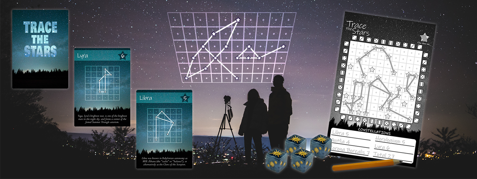 In Trace the Stars, players roll star-themed dice to locate and mark the coordinates of stars and will then draw lines to connect them, forming intricate constellations on their star maps. By using spatial awareness and strategic planning, multiple constellations can be made to fit within the star map grid that each player has in front of them. Each completed constellation earns points equal to the number of stars required to complete it. While smaller constellations, such as Canis Minor, may be easier to plot, larger ones like Gemini may be worth the wait.