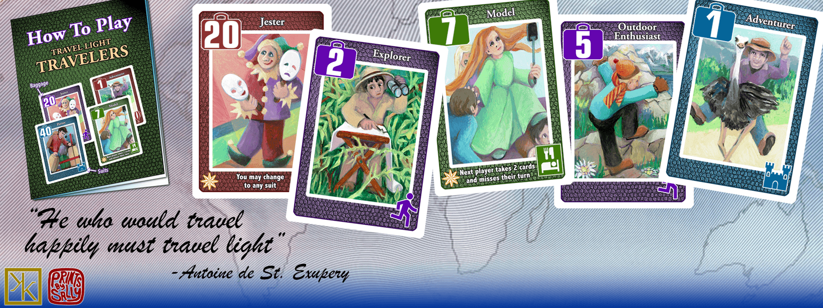 Travel Light Travelers is the perfect game for anyone who enjoys traveling or travel-themed card games. It's a fun and easy to learn game with beautiful hand-painted artwork by Sally Rhone-Kubarek.