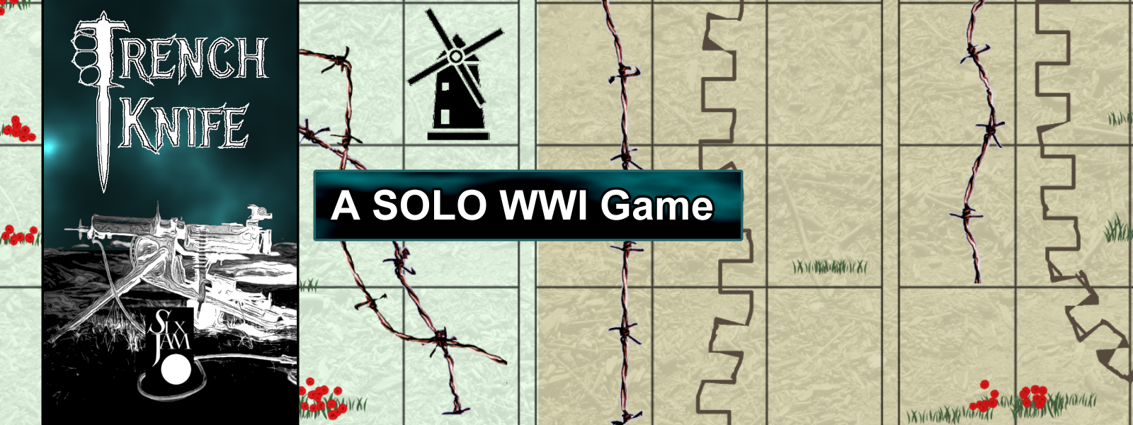 Trench Knife is a mint tin solo WWI game. You play as the Allies. Using a variable Action Point system, you must maneuver your squads, suppress the enemy, and assault the German trenches, in the attempt to take a vital point in the war. The Germans have the upper hand, with HMG nests and The Red Baron on their side.