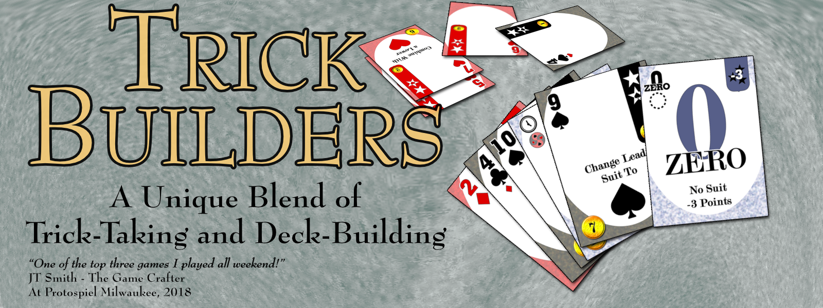 Trick Builders is a combination trick-taking / deck-building / drafting game where 2-4 players (5-6 with additional cards) compete to win tricks and score points. Between hands players will acquire cards for the next hand. These cards will give them a benefit for the round they are acquired, but then go into the common deck for future rounds.