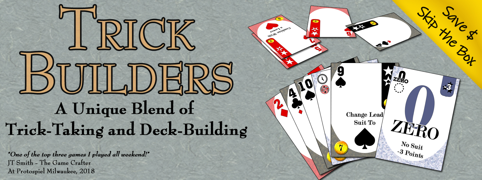 Trick Builders is a combination trick-taking / deck-building / drafting game where 2-4 players (5-6 with additional cards) compete to win tricks and score points. Between hands players will acquire cards for the next hand. These cards will give them a benefit for the round they are acquired, but then go into the common deck for future rounds.