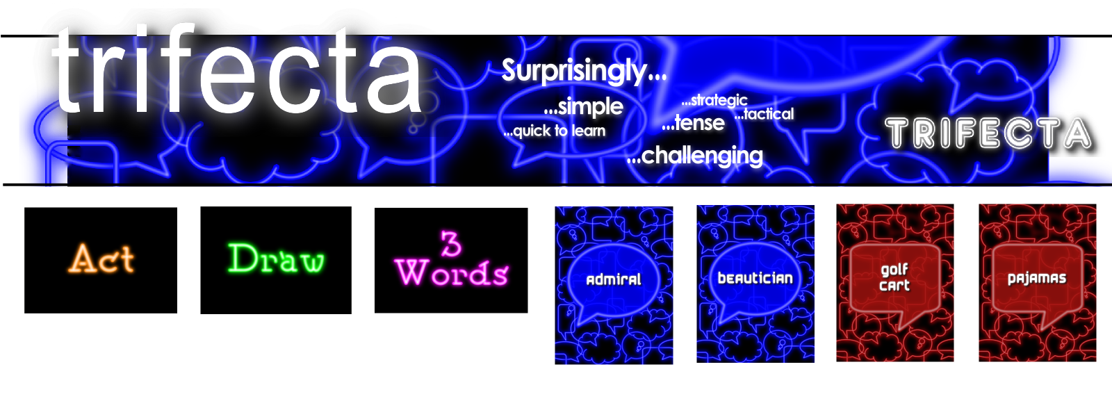 Each game features Acting, Drawing, and giving 3-Word clues to get teammates to guess words on cards. This is familiar and timeless proven fun, and is easy to teach and learn.