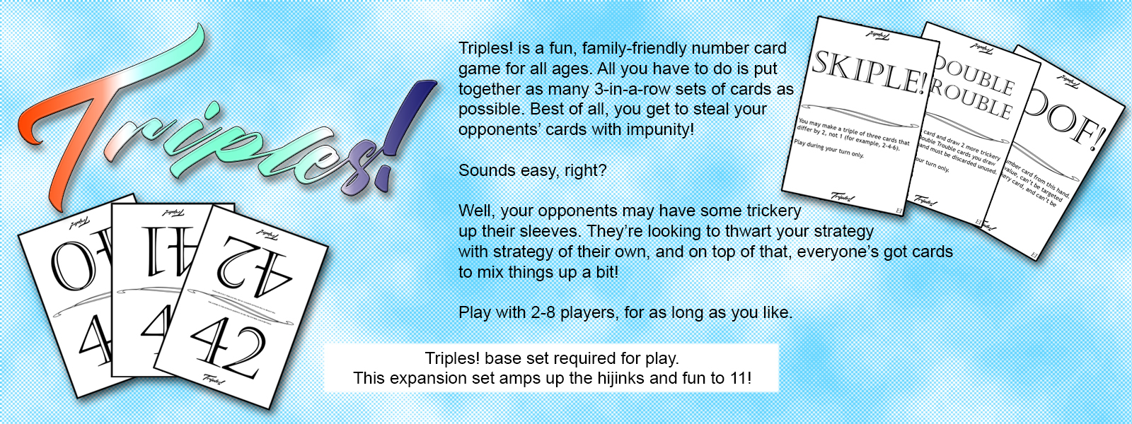 Triples! is a fun, simple, quick-to-learn number card game for all ages. Each hand, each player gets 10 face-up number cards. All you have to do is put together as many 3-in-a-row sequences of cards (called Triples) as you can, while getting rid of as many free cards as you can. Best of all, your opponents will do that for you by stealing your free cards with impunity! While the basic premise is simple, you have to watch out for what triples your opponents are looking to put together.