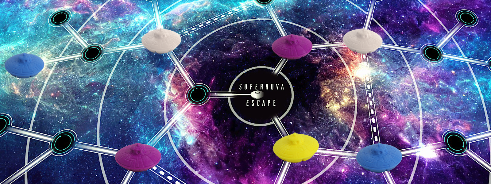 UFOs - Supernova Escape is created for The Game Crafter's community contest That Cool Stock Part Challenge. The Game Crafter has a lot of unique 3D printed components, and we are really charmed by the cute UFOs. Our ambition was to create a game with a cool table presence where at some point the board contains a flock of space ships, UFOs. Limited by the contests rules, we have kept things simple .... but tactical. At first, the game feels a bit like checkers in space, but after a few round you'll find it much more interactive, better-looking and more fun.