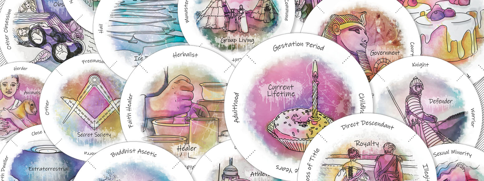 I created this deck to be a tool to help users detect the types of past lives that lie under phobias, fears, relationship issues, and other concerns. This deck contains every type of theme I could think of, including both positive and negative scenarios. The circular shape was chosen because it offers the ability to explore different aspects of a major theme.