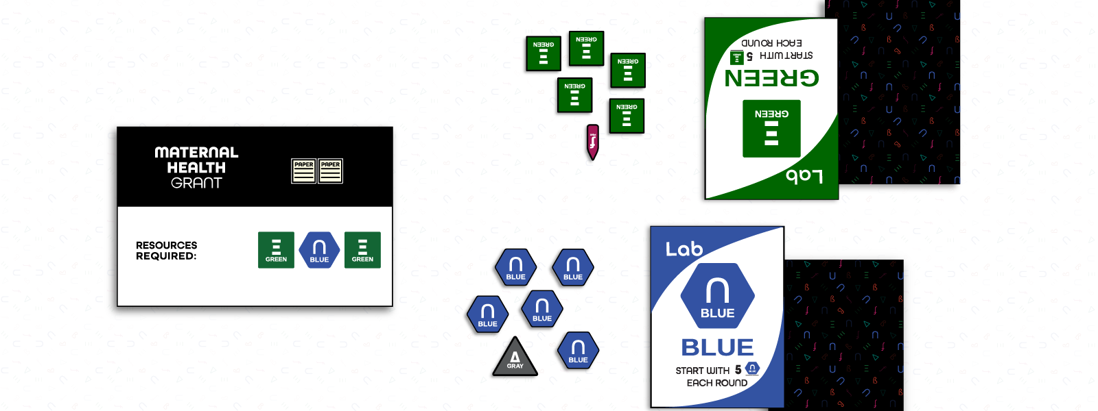 Getting Papers and accomplishing your Personal Goal both require Grants. Getting Grants requires turning in a mix of Resource tokens. If you want a Grant and its associated Papers but you don't have all the required tokens yourself, it's time to find collaborators. Can you figure out a way to divide up the required resources and the rewards that will please everyone involved? Can you work with other people while still getting enough Papers to avoid losing?
