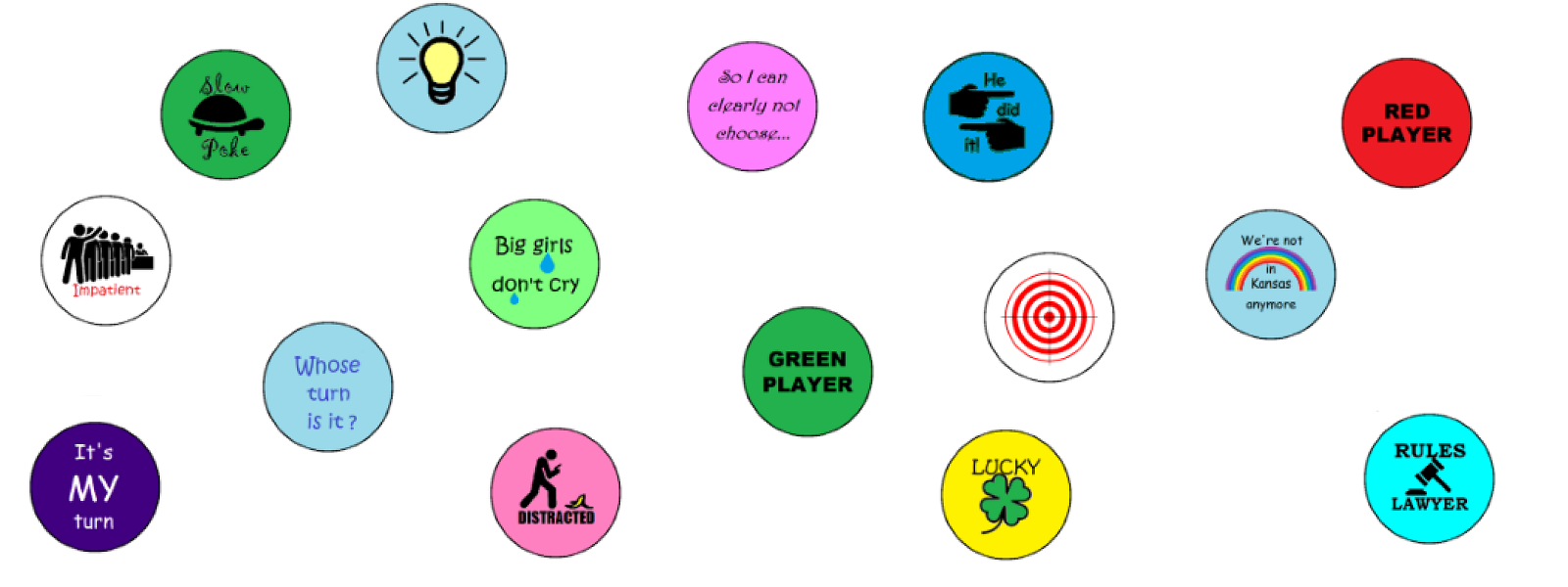 Cute chits to hand to other players while playing any game. Includes a set of player color chits to indicate your color.