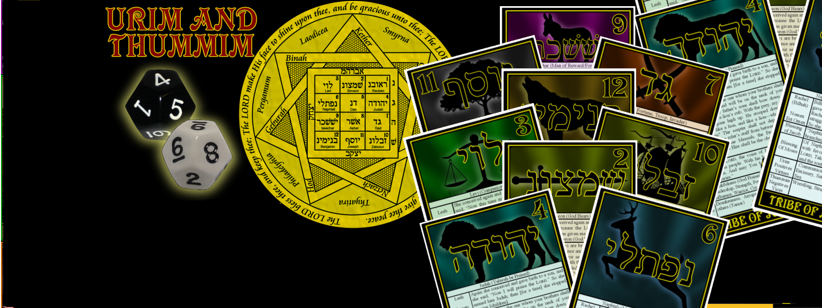 The Urim and Thummim Divination Kit 13 Cards (Tarot Sized), Two 12 Sided Dice (1 White, 1 Black), and a small Carrying Bag. The purpose of the set is to provide a functional method of using the Urim and Thummim in conjunction with the Breastplate of Judgment as a system of Divination.