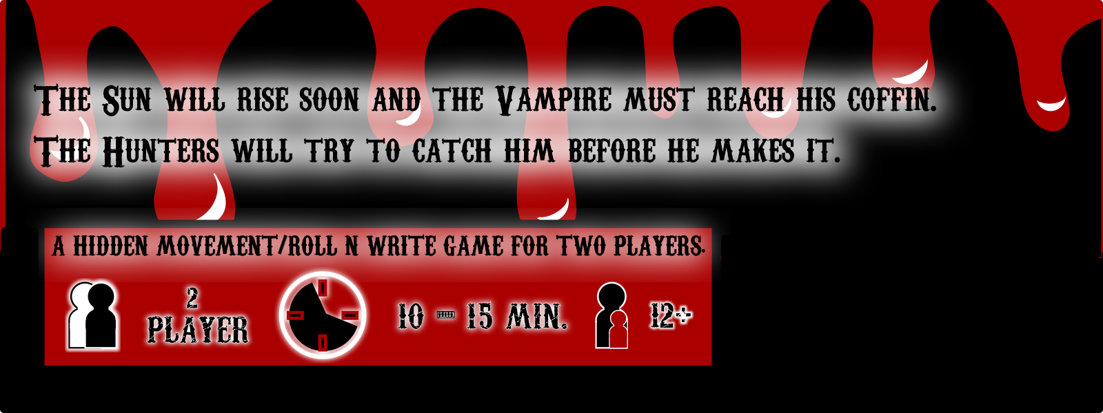 Each team takes turns rolling the die. Hunters may split the roll, Vampire must use all pips. Hunters travel in a straight line in any direction, Vampire cannot move diagoanlly but can fly over obstacles and change direction. If hunters close in, Vampire reports which hunter is "in range", hunters may ask for Vampire's previous location or distance to chosen hunter. Vampire has 12 turns before the sun rises and they become "bat toast".