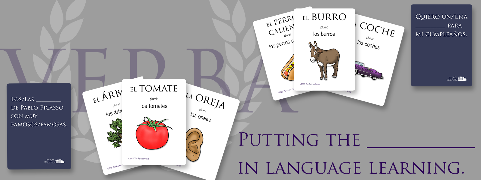 All VERBA players benefit from seeing high frequency words, with many repetitions, in a context that fosters authentic learning and comprehensible input. As with all of The Pericles Group's educational games, the play objectives and the learning objectives are one in the same. Players win by making comprehensible sentences, scaffolded by the cards, the images, and the helpful hints included on the sentence cards. We always want to ensure that the learners are seeing correct forms and those forms are continually reinforced by the mechanics.