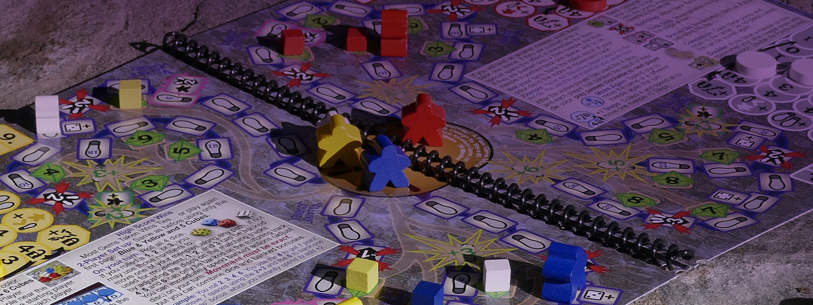 In Villain's Journey: A Few Gems More the players are all villains rolling dice to bank and spend movement in a variety of ways. Drop onto another meeple and move it backwards. Even when it's not your turn you get to bank the roll of your die for movement or maybe collect points to win the game.