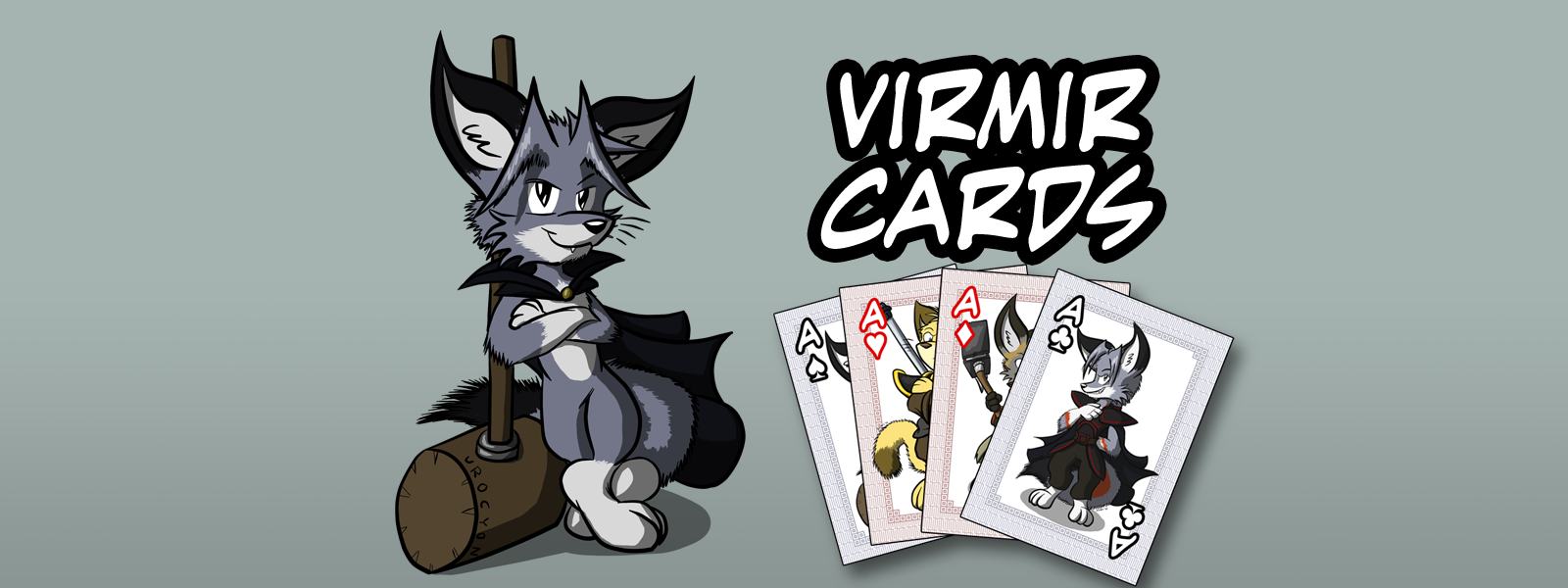 Virmir-Cards is a standard deck of playing cards featuring a cartoon character drawn by Virmir on every single card! This deck is built just like any playing card deck— four suits of 13 cards each, plus two jokers. 54 cards total! Also included is a cast card listing the names of all the characters.