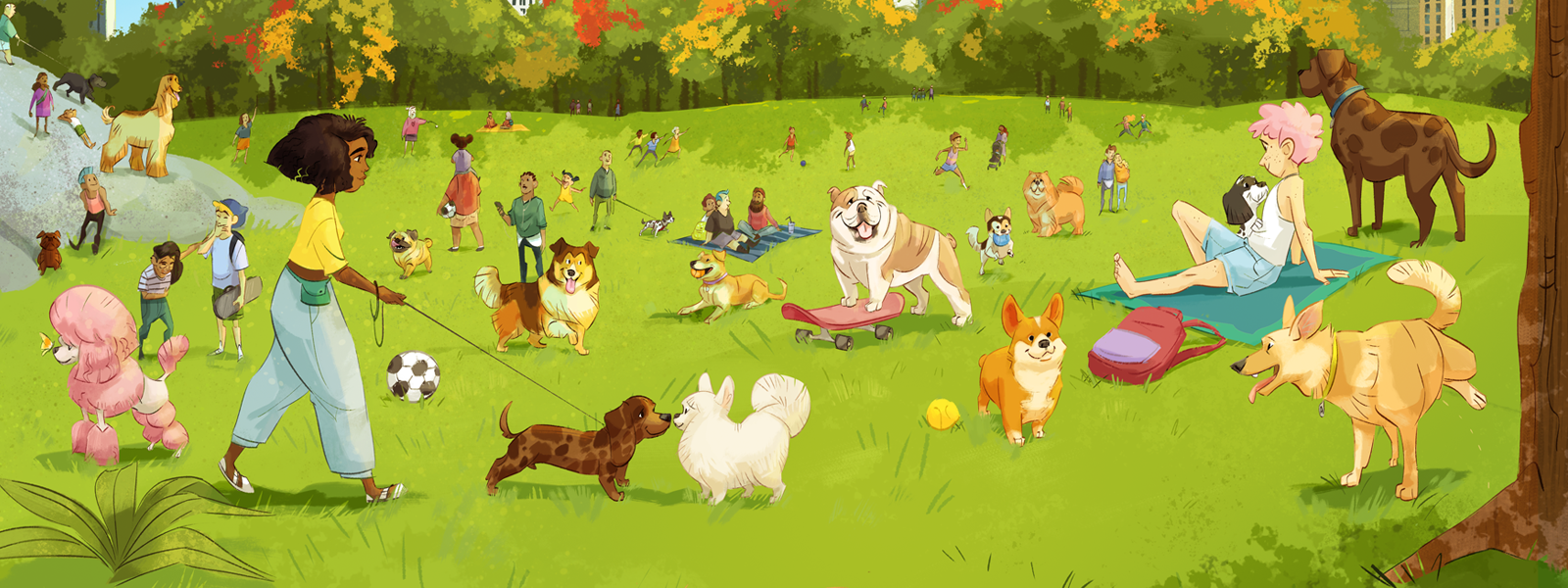 While walking your dog around the park, collect as many bones as possible, have some adventures, compete with other dogs for bones, save somebody from drowning and assist the police in capturing some bad guys. Not bad for a walk in the park! Each bone you collect is worth points. The game ends when the first player reaches the Metropolitan Museum and receives the “Golden” bone and each player has taken their final turn. At the end of the game, the dog with the most bones (points) wins.