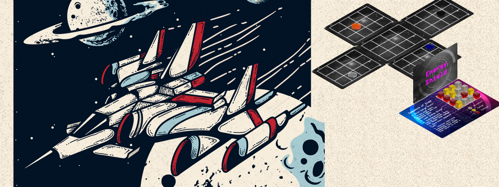 Warped Drive is a space-based, small-scale tactical battle for 2-4 players. Players each pilot a spaceship with a warped drive. The drive is a 4 x 4 grid of cubes with three different functions: move, range and damage. Players select, in secret, a starting cube face and then select a direction and place a cube denoting their action sequence end six cube faces away. Once all players actions are revealed, play happens simultaneously one action at a time, where all movement happens then ships get to fire depending on what actions players have programmed. If a ship is hit, they lose cubes from their warped drive based on the total damage dealt. Once a player loses all of one cube type, the game ends and the player with the most cubes remaining wins.