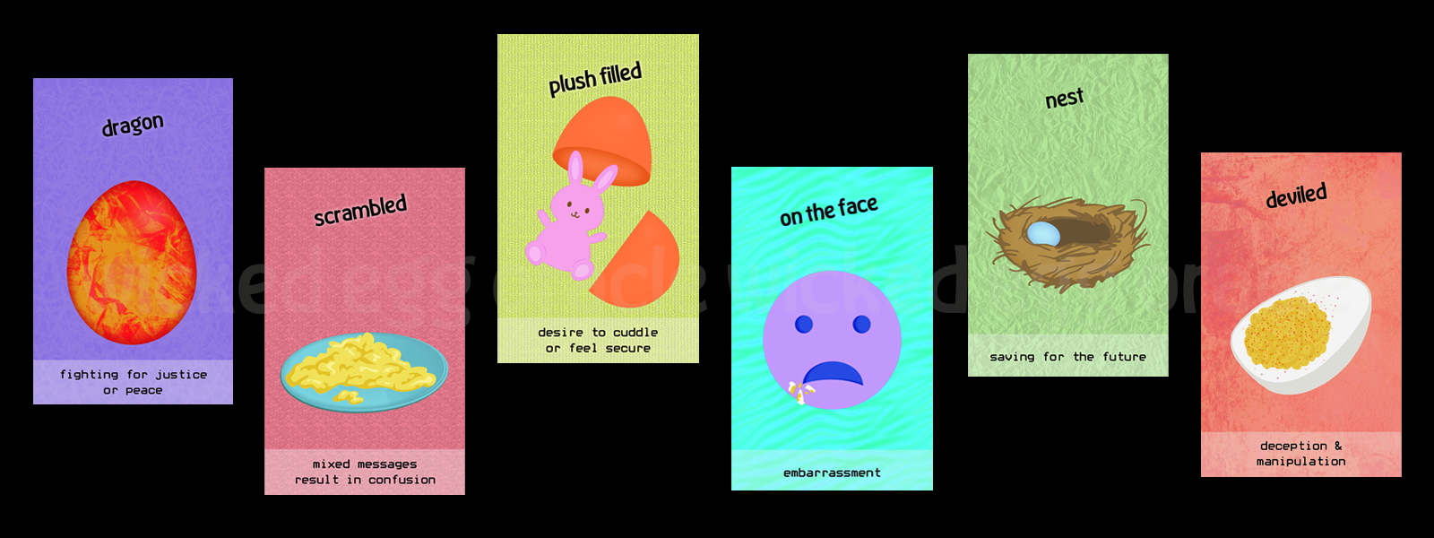 Wicked Egg Oracle depicts eggs in a wide range of scenarios and plays on how each relates to the human condition.