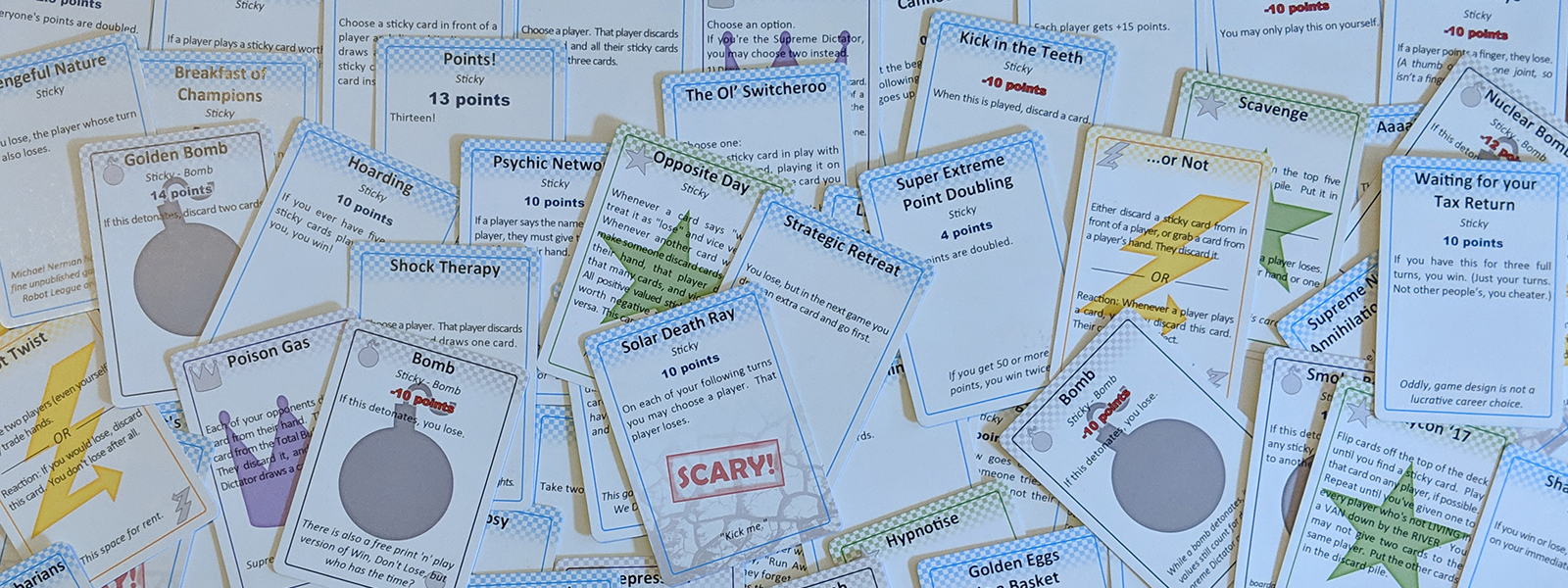 The object is to win, and not to lose. Win, Don’t Lose is a fast, fun and hilarious card game with only a handful of rules. While there are routes to victory described in the rules, many of the cards supply their own way to win, such as setting your opponents on fire, or managing to stick around long enough to get your tax return. The game has multiple "modules", which can be added over time, so that a new player can play the basic game after only a minute of explanation. Each module adds another rule to the game, and the game builds on itself.