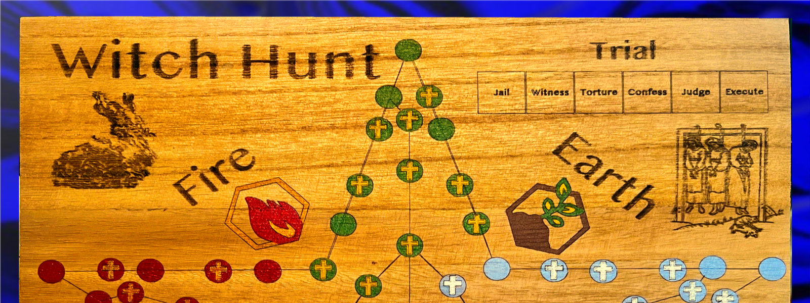 The Inquisition is coming to the village. Players perform crafts to gain points. Their craft may expose them as a witch. Avoid being tagged by the Inquisitors as a witch and being burnt at the stake.