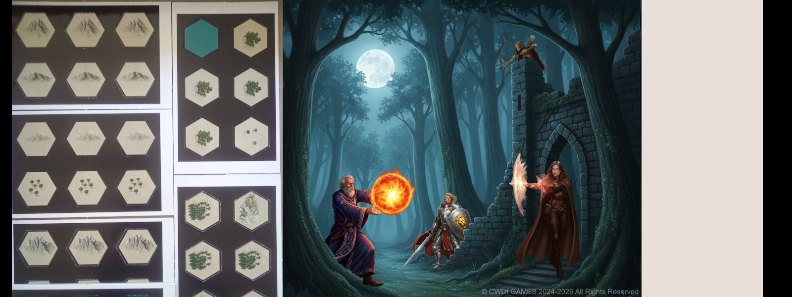 Contains 42 hex terrain pieces. All are double sided. Terrain hexes have different terrain on each side. Water hexes have water on each side.