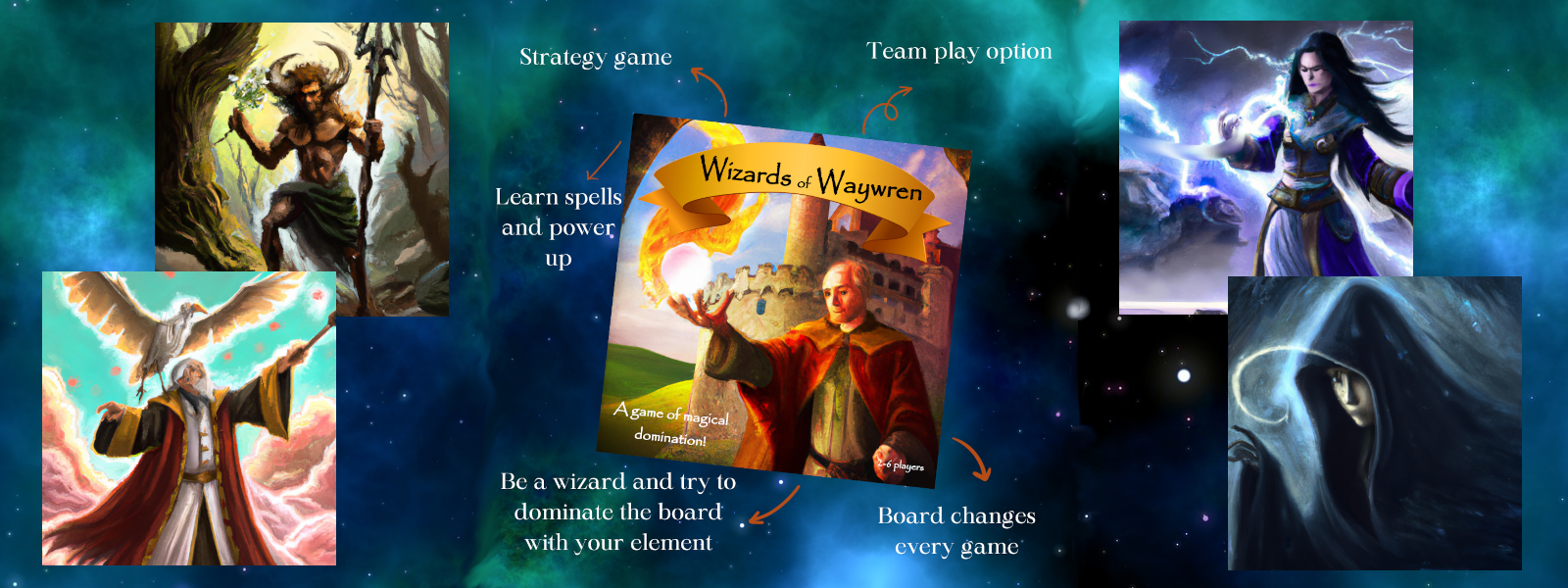 This is a strategy board game of conquest and character growth. Choose to grow your mage's magical prowess to master more powerful spells for late game conquest, or just spread your magic as profusely as possible early on throughout the land of Waywren. Beware the other mages that seek magical dominion in the same domain!