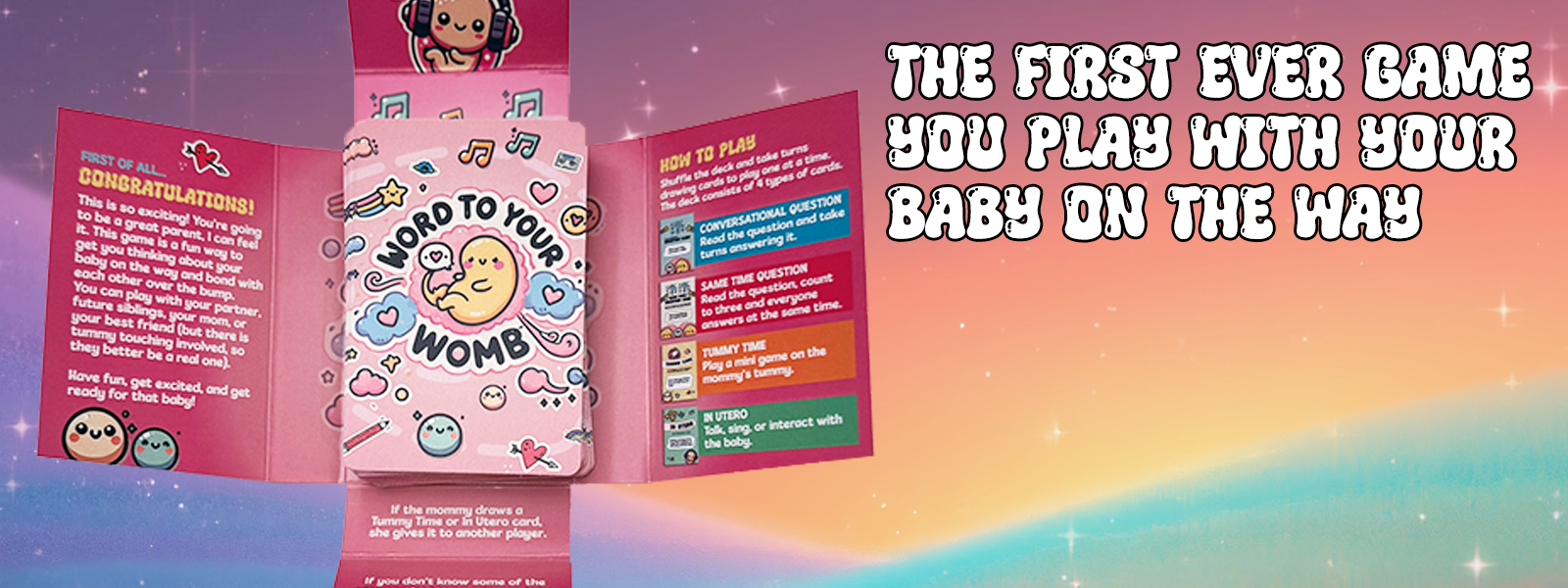 Word to Your Womb is the first-ever card game you play with your baby on the way! Bond over the bump with conversational questions and mini games. The perfect way for new parents or siblings to get excited about your growing family.
