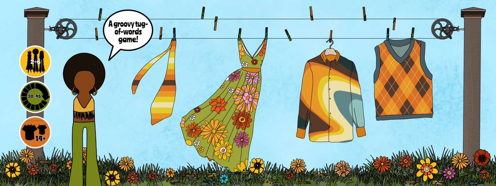Players race to arrange funky 1970s laundry items on shared clotheslines, spelling words and scoring points. They'll also collect and arrange laundry in their baskets to earn game-end bonuses. The player with the most points at the end of the game wins.
