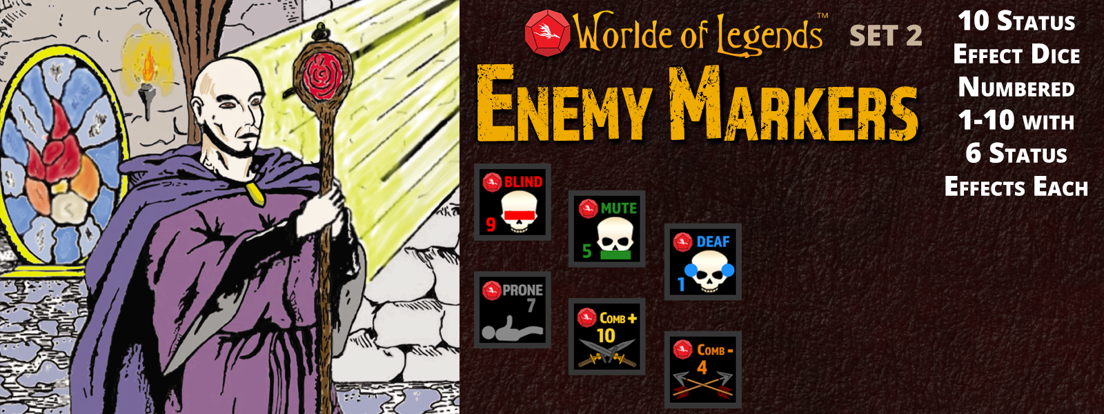 The Worlde of Legends↔ Enemy Markers Set 2 is a set of 10 six-sided dice with six different status effects, one on each side. They are designed to be an economical substitute for expensive miniatures. Worlde of Legends™ Enemy Markers dice are numbered so you can have 10 enemies on the field and easily track their status and their location. In addition, the status effects are color-coded for quick identification.