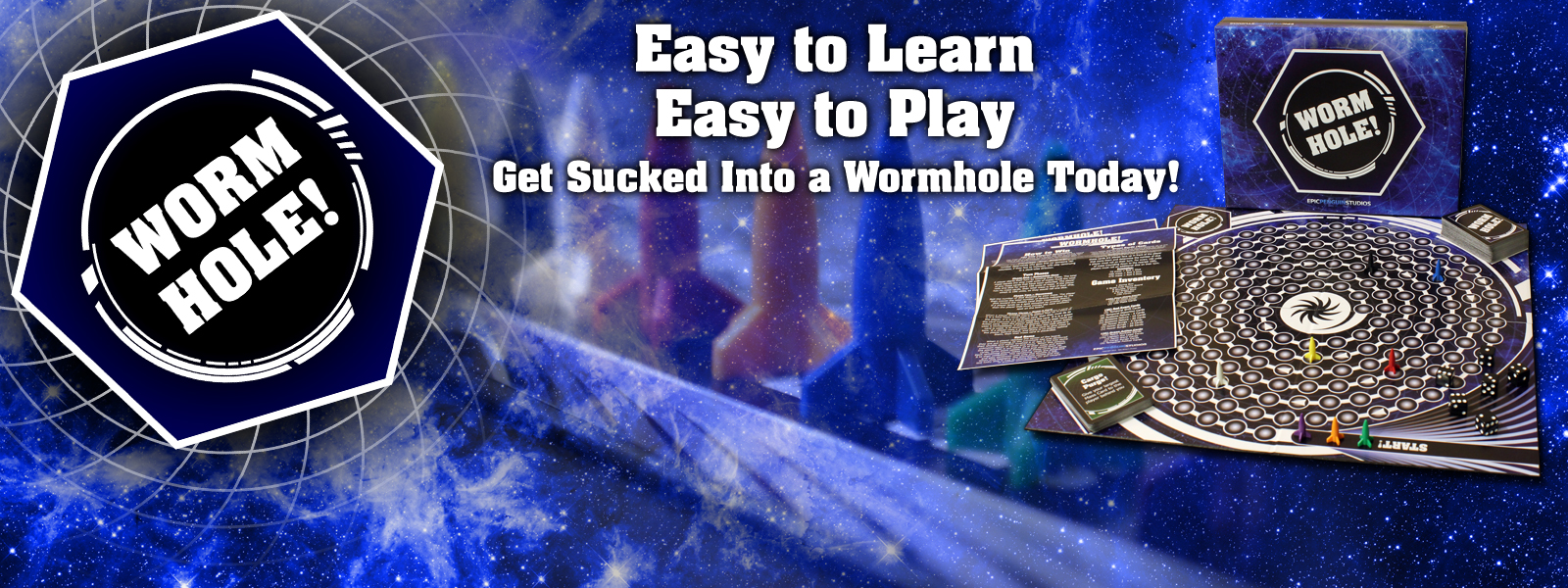 Wormhole! is a space themed board game for up to 8 players that turns the traditional rules of game play inside out. Everyone starts out at the edge of the board on a spiral track and takes turns rolling dice and drawing cards until everyone except one lucky individual reaches the center, making them the winner.