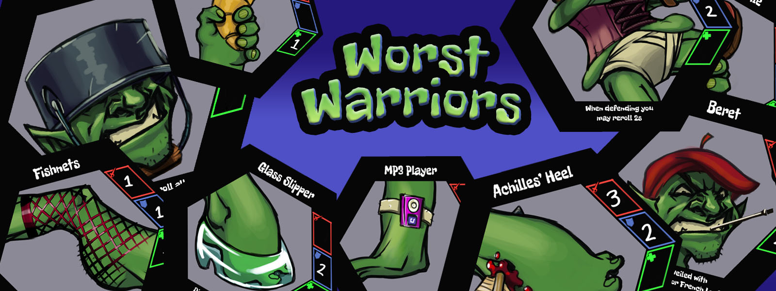 Worst Warriors is an easy to pick-up-and-play game, filled with ridiculous cards creating hilarious combinations. If you've enjoyed Munchkin and King of Tokyo, then this is the game for you!