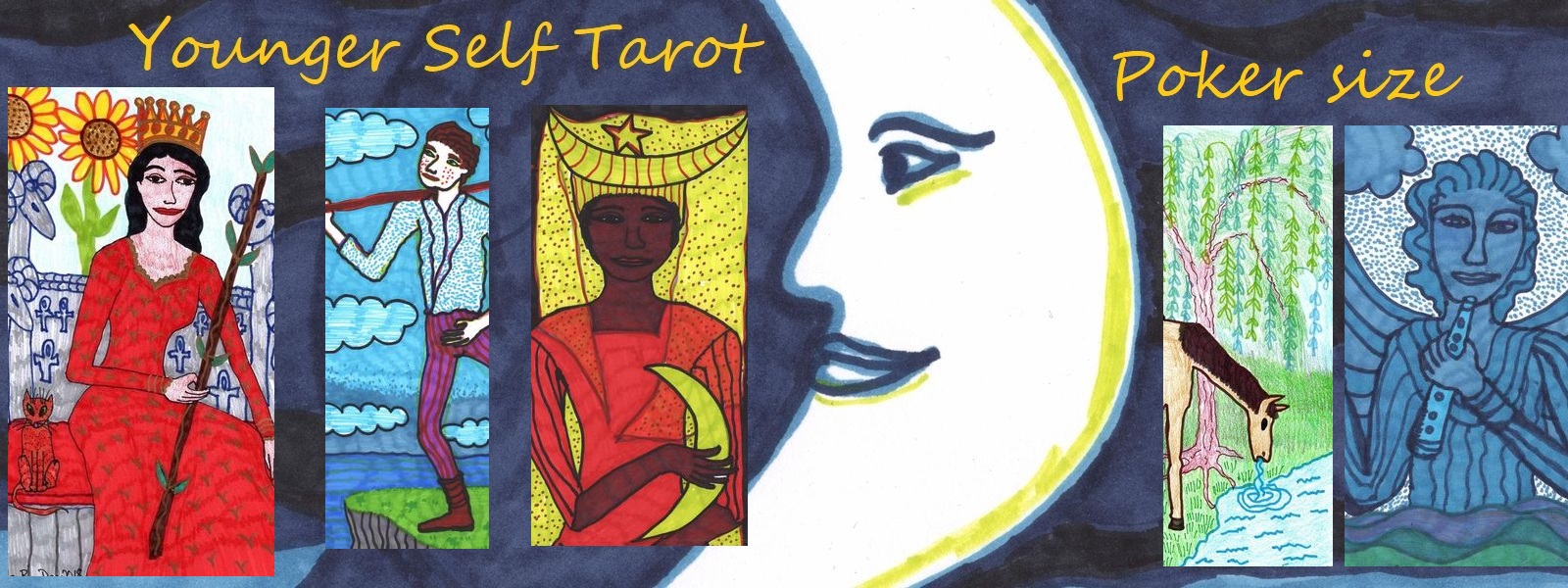 This new deck, done in a very quick spontaneous way with Sharpies and crayons, harks back to my childhood love of drawing with felt-tip pens! Partly for that reason, it is called the “Tarot of the Younger Self”, but another reason is the influence of The Spiral Dance by Starhawk — to me, as to many others, a life-changing book about paganism. Starhawk talks vividly about different aspects of ourselves using the names Younger Self and Talking Self, and these terms have stuck in my mind thirty years or more since I first read her groundbreaking book.