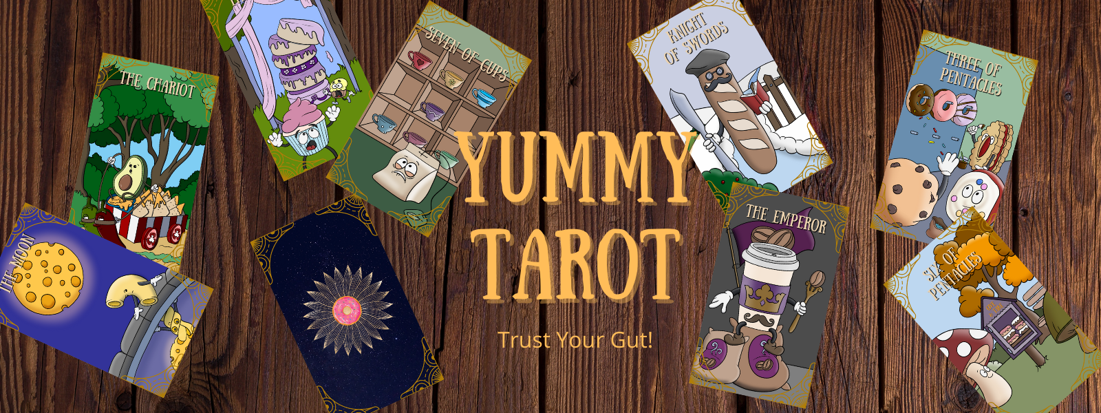 The Yummy Tarot is designed by Jessica MacLean, author of the Witchlet Academy Series. This traditional tarot deck is meant as a lighthearted and whimsical approach to divination.