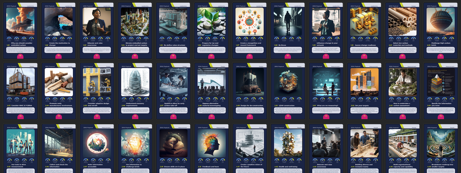 These cards linked to the ZERO Construct Playbook can spark conversation, create ideas and educate individuals and teams into actions to reduce carbon across the construction industry.