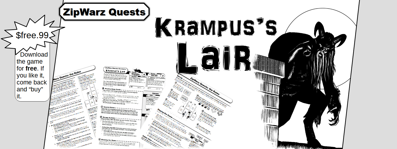 Welcome to ZipWarz Quests: Krampus's Lair, a rules-lite dungeon crawl from 1 to 3 players. Using a deck of cards, dice or chess pieces, some tokens, and these rules, you can complete a full adventure in 20 minutes or less.