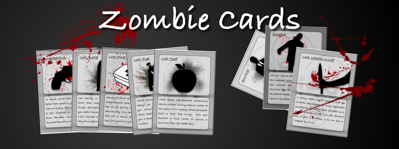 Premise- The Zombie Apocalypse is upon us, and it's much worse than TV, Comics, and Movies have prepared us for! Zombie Cards is a very fast, very fun, and surprisingly strategic game where you must search for essential Equipment while trying to keep your Survivors safe from Zombies, Traps, and Bandits. Search and scavenge as much as your nerve will allow, but once your last Survivor is gone, it's Game Over! Optional (but thoroughly enjoyable) drinking game rules included!