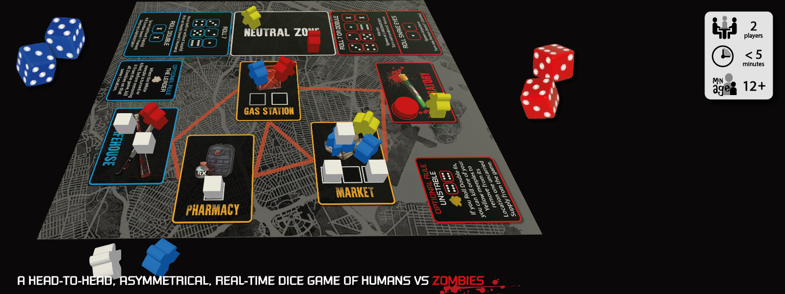 In ZOMBOMINATION, every game is a desperate fight for survival. Zombies swarm the city, hungry for flesh and brains, while Humans scavenge for scraps. Is this really living? Will the Humans just settle in their Safehouse to live one day at a time? Or will they risk it all to destroy the Laboratory and end the Zombie infestation? Will the Zombies end the Human race?