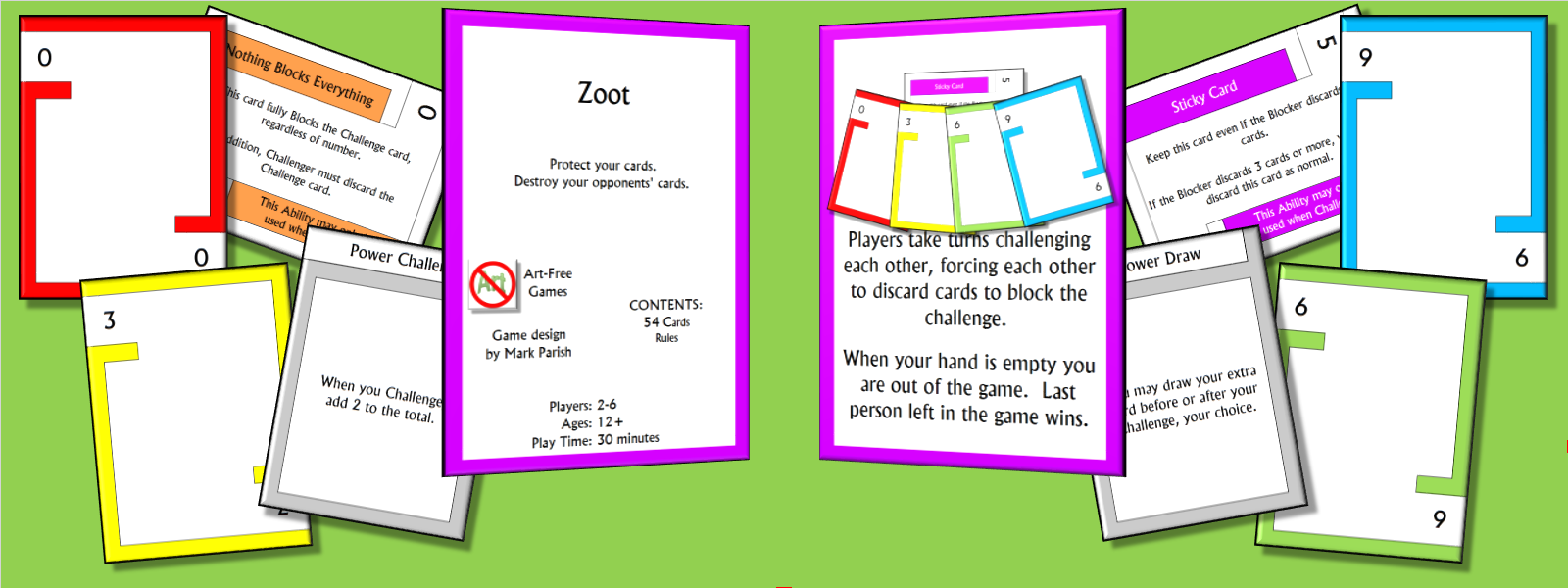 As with all Art-Free Games, Zoot comes with a number of Optional Rules you can use to modify how you play the game. But Zoot has more Optional Rules than most of our games. You can combine different Optional Rules to make thousands of ways to play.